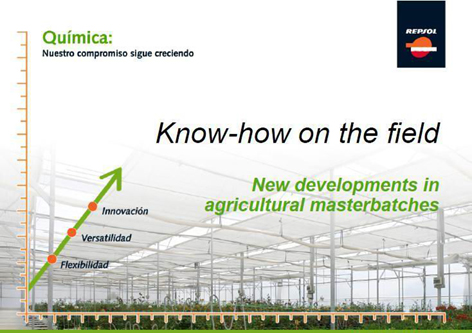 Repsol lleva más de 40 años trabajando junto al agricultor, ofreciéndole una gama completa de compuestos para cubiertas de invernadero, “demostrando así el gran compromiso que le une a la agricultura, forjado en la experiencia generada en la producción y optimización de formulaciones de compuestos agrícolas, diseño de métodos específicos de análisis, nuevos equipamientos y ensayos de larga duración en campo”.