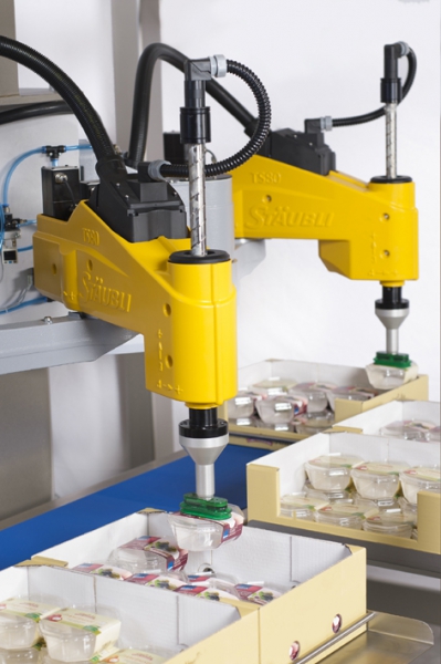 SVZ toma una decisión calculada sobre el nivel de automatización que es óptimo para la aplicación individual. En el caso de la nueva línea de productos alimenticios, se optó por una solución híbrida en la que el robot realiza la tarea principal, a saber, el reenvasado real de las bandejas, siendo realizada la carga del transportador de forma manual. “Con este sistema semiautomático, hemos logrado reconciliar los criterios de alto rendimiento y flexibilidad máxima”, añade Bernd Bleher. “Las tareas pick-and-place que son tan importantes para los tiempos de ciclo son realizadas por el robot ultra-rápido Stäubli TS80 Scara. Mientras tanto, la carga de los transportadores, además de la extracción de los paquetes mixtos terminados, se realizan a mano, sobre la base de que la velocidad es menos importante que la flexibilidad”.