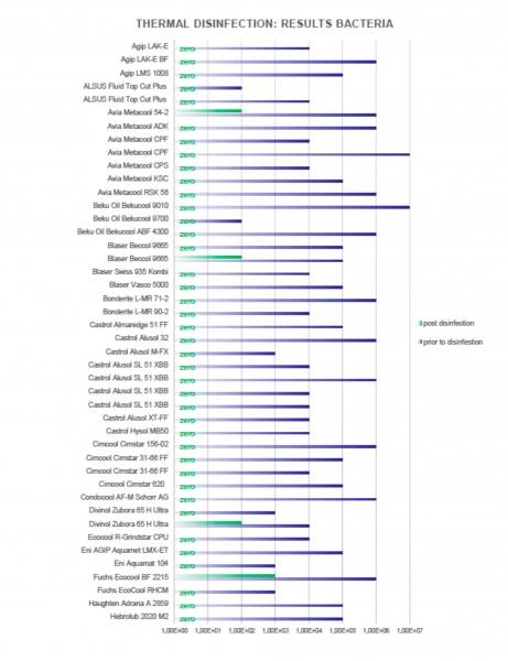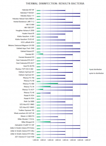 Si la empresa tiene que reducir o incluso detener la producción durante un período de tiempo largo, muchas de las máquinas-herramienta pueden después estar fuertemente infectadas con hongos o bacterias, y el refrigerante puede estar irreparablemente infectado. En Filter 2000 pueden ayudar muy eficazmente con su desinfección térmica: Thermo-Des, aspira el refrigerante, lo calienta hasta 65°C, lo enfría de nuevo, y reinyecta el refrigerante en la máquina-herramienta. Como los hongos y las bacterias son generalmente destruidos a 62-63°C, en el 90% de los casos se destruye el 100% de las bacterias, y en el 10% restante se reduce las bacterias en un factor de 10^2 a 10^4. Todos los hongos se destruyen en el 100% de los casos. Según los resultados de una serie de pruebas realizadas por ph-cleantec en Fellbach.