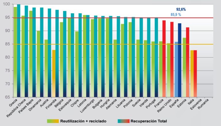 Los últimos datos aportados por Comisión Europea en reciclabilidad son los relativos a 2018. En la gráfica de Sigrauto se puede comprobar cómo, si bien los datos en España son elevados, con un 85,90% de reutilización y reciclado y un 92,60% de recuperación total, todavía no llega al mínimo establecido por la Unión.