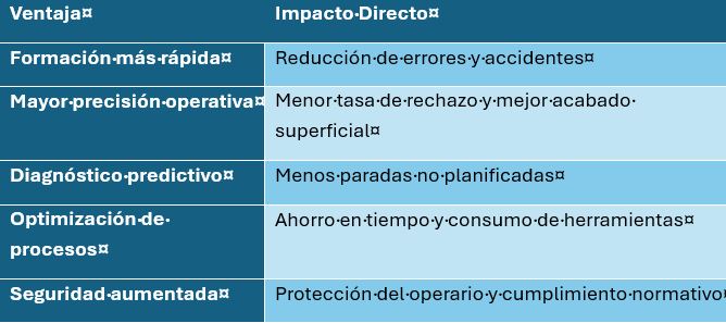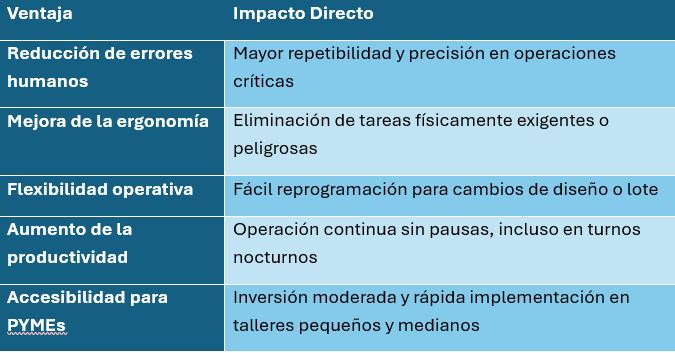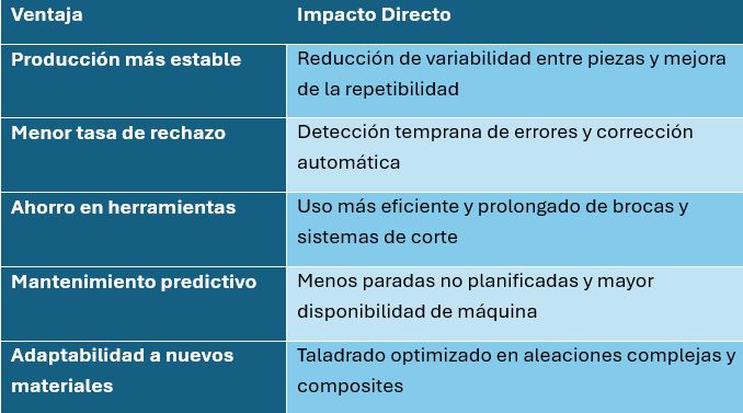 En la tabla 1 se presentan los principales beneficios de la robótica colaborativa. La automatización y la robótica colaborativa están redefiniendo el taladrado de metales como un proceso inteligente, seguro y adaptable. Lejos de reemplazar al operario, los cobots lo complementan, liberándolo de tareas repetitivas y permitiéndole enfocarse en la supervisión, el control de calidad y la mejora continua. En un entorno industrial cada vez más exigente, adoptar estas tecnologías no es solo una ventaja competitiva: es una evolución necesaria hacia una fabricación más eficiente, humana y sostenible.