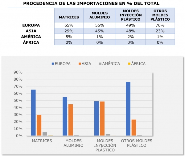 Europa sigue siendo el destino principal de las exportaciones españolas de moldes y matrices. América le sigue en segundo lugar, pero a gran distancia y donde solo los moldes de inyección de plástico y otros moldes ya han conseguido una buena cartera de clientes.