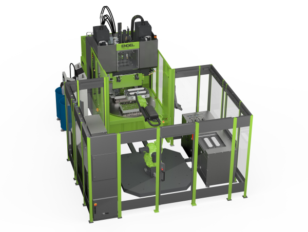 El elemento central de esta solución completa, compacta y fiable, es una máquina de moldeo por inyección vertical Engel insert 150 con una fuerza de cierre de 1.500 kN y una mesa giratoria integrada. Esta configuración permite la inyección y el desmoldeo simultáneos, duplicando prácticamente la producción con un tiempo de ciclo de 50 s.