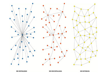 - Red descentralizada: aparece por interconexión de los nodos centrales de varias redes centralizadas. Como resultado no existe un único nodo central, sino un centro colectivo de conectores.