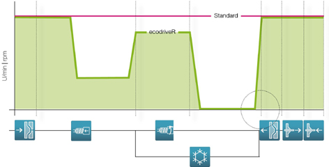 ecodriveR permite que las inyectoras hidráulicas con un motor asíncrono y bombas electro-hidráulicas (EHV) de capacidad variable puedan ser controladas también en función de la demanda. Esto se consigue mediante la instalación de un convertidor de frecuencia que ajusta la velocidad del accionamiento de bomba a la cantidad de energía requerida. ecodriveR se ajusta utilizando una sencilla interfaz de la unidad de control de la máquina.