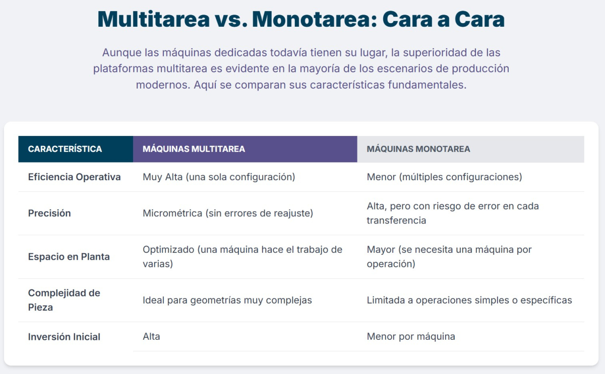 La superioridad de las máquinas multitarea sobre las monotarea o convencionales (manuales) es evidente en la mayoría de las aplicaciones, aunque cada tipo de máquina mantiene su nicho de mercado.