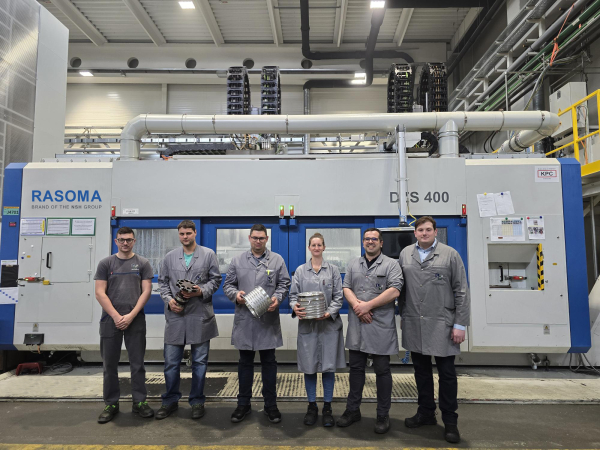 Para su uso en la fabricación en serie, la máquina se equipó lateralmente con una zona de recogida para piezas en bruto y una zona de descarga para piezas terminadas. Los componentes se suministran y retiran mediante cintas transportadoras. Con el montaje manual, es posible incorporar un almacén automatizado con capacidad para entre 10 y 20 componentes. Esto permite operar varios sistemas mientras el empleado puede realizar otros procesos simultáneamente a la producción. “Hemos implementado una automatización en serie extremadamente sencilla. No se requieren robots ni bloques en la máquina. Los operarios pueden colocar las piezas directamente en la cinta transportadora de palés”, explica Thomas Lötzsch, director de ventas de NSH Technology. Opcionalmente, está disponible la carga y descarga de piezas totalmente automatizada para varias máquinas con un sistema de transporte central. La máquina se integra fácilmente en un entorno de producción existente. Las dimensiones de instalación relativamente compactas de 7,50 x 2,60 m contribuyen a ello. El diseño de la Rasoma DZS 400-2 se basó en la colaboración con LTH Castings, socio con amplia experiencia en fundición y especialista en el mecanizado de componentes complejos, de alta calidad y paredes delgadas de aluminio fundido a presión. Por lo tanto, el diseño tuvo en cuenta directamente la experiencia práctica y las necesidades del usuario.