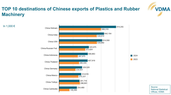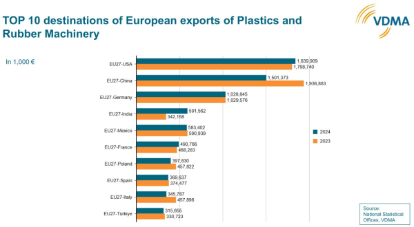 El comercio de maquinaria para plásticos y caucho presenta una alta interdependencia a nivel internacional. El año pasado, se exportó maquinaria para plásticos y caucho a nivel mundial por un valor total de 28.200 millones de euros. Europa cuenta con la la mayor cuota de mercado, con un 47%. Le siguen China (29%) y, a mayor distancia, Japón (7%). Los principales socios comerciales de Europa son EEUU y China. Latinoamérica -en particular México y Brasil- también son importantes clientes de la maquinaria europea para plásticos y caucho. En total, las exportaciones de los fabricantes europeos de maquinaria para plásticos y caucho se redujeron ligeramente un 2% en 2024, alcanzando los 13.000 millones de euros.